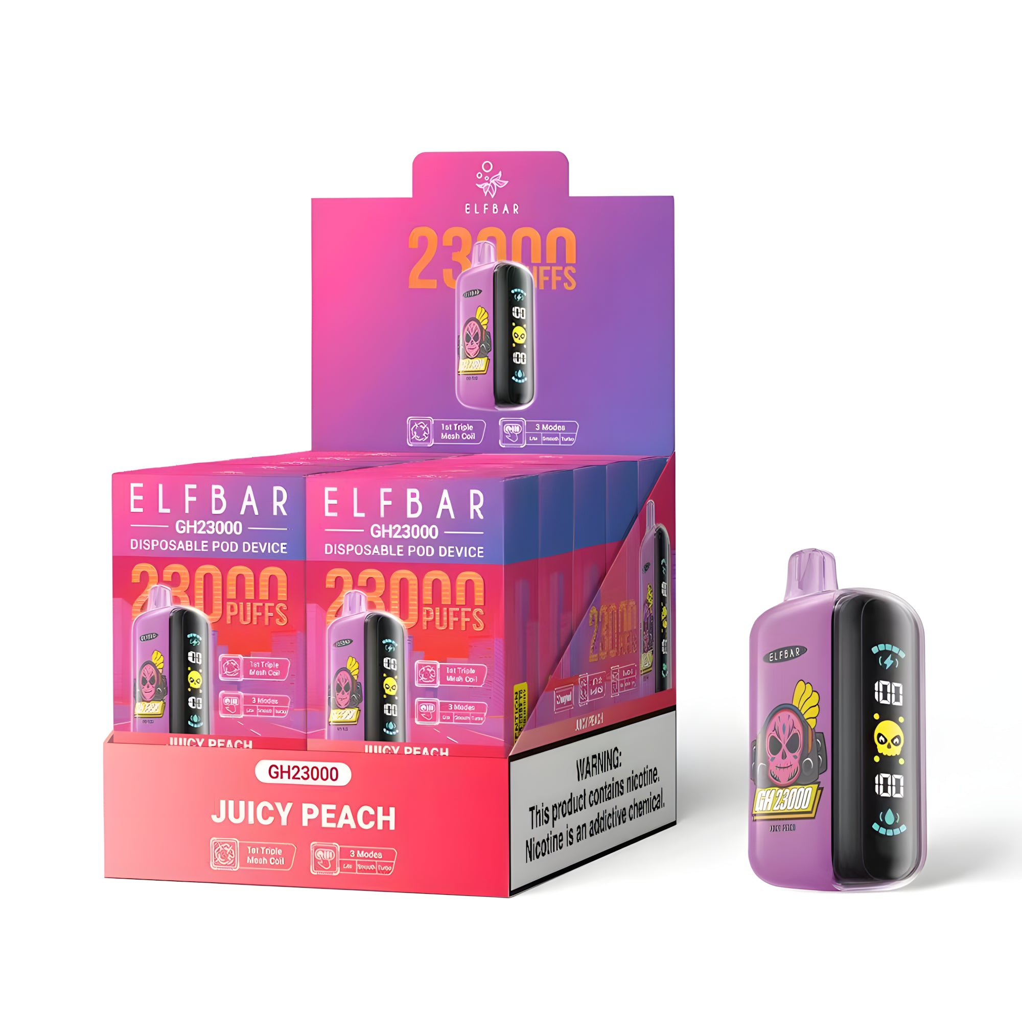 Az Elf Bar GH23000 Juicy Peach 2% eldobható vape egy kompakt és kényelmes eszköz, amely a dohányosok és vapelők igényeihez lett tervezve, akik egy gyümölcsös, lédús és prémium ízélményt keresnek. Az előre töltött tartály akár 23 000 slukkot biztosít, és az eszköz három különböző módban használható. A nagy LED kijelző megmutatja, hogy éppen melyik módban van az eszköz, valamint folyamatosan nyomon követheted az akkumulátor és az e-folyadék szintjét.