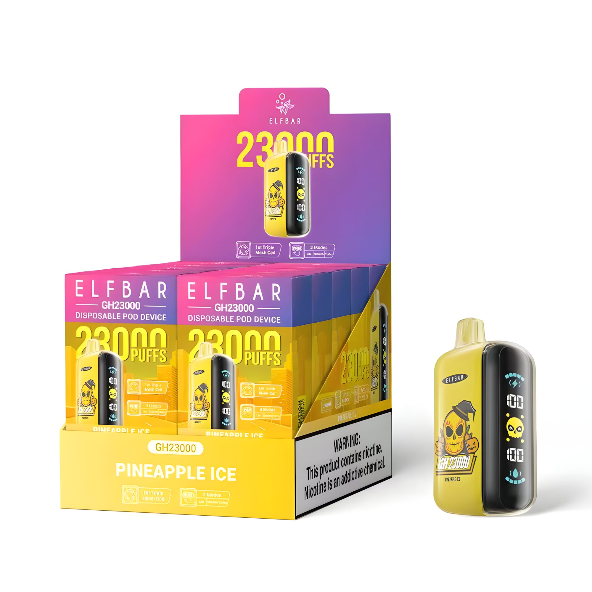 Az Elf Bar GH23000 Pineapple Ice 2% eldobható vape egy kompakt és kényelmes eszköz, amely a dohányosok és vapelők igényeihez lett tervezve, akik egy gyümölcsös, lédús és prémium ízélményt keresnek. Az előre töltött tartály akár 23 000 slukkot biztosít, és az eszköz három különböző módban használható. A nagy LED kijelző megmutatja, hogy éppen melyik módban van az eszköz, valamint folyamatosan nyomon követheted az akkumulátor és az e-folyadék szintjét.