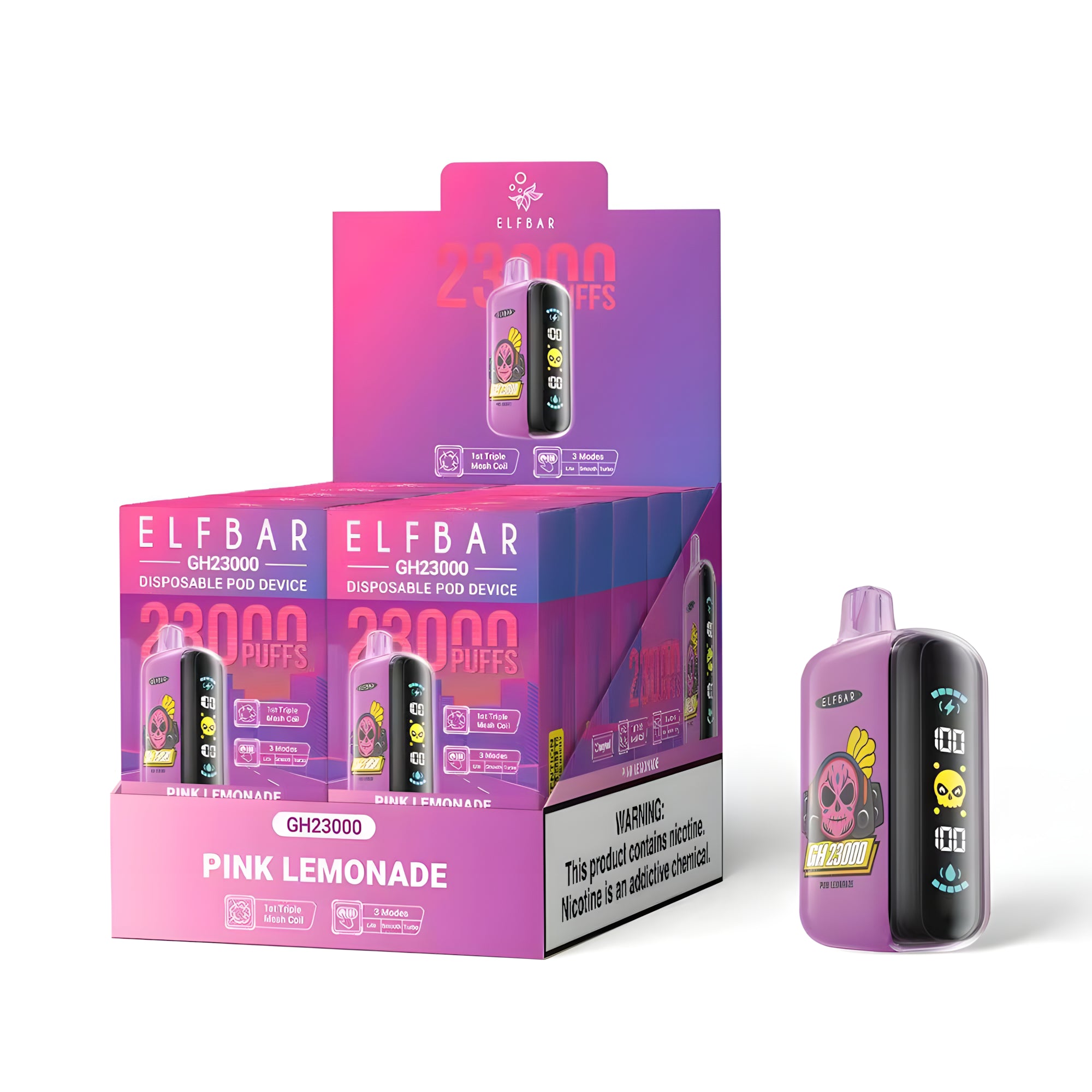 Az Elf Bar GH23000 Pink Lemonade 2% eldobható vape egy kompakt és kényelmes eszköz, amely a dohányosok és vapelők igényeihez lett tervezve, akik egy gyümölcsös, lédús és prémium ízélményt keresnek. Az előre töltött tartály akár 23 000 slukkot biztosít, és az eszköz három különböző módban használható. A nagy LED kijelző megmutatja, hogy éppen melyik módban van az eszköz, valamint folyamatosan nyomon követheted az akkumulátor és az e-folyadék szintjét.