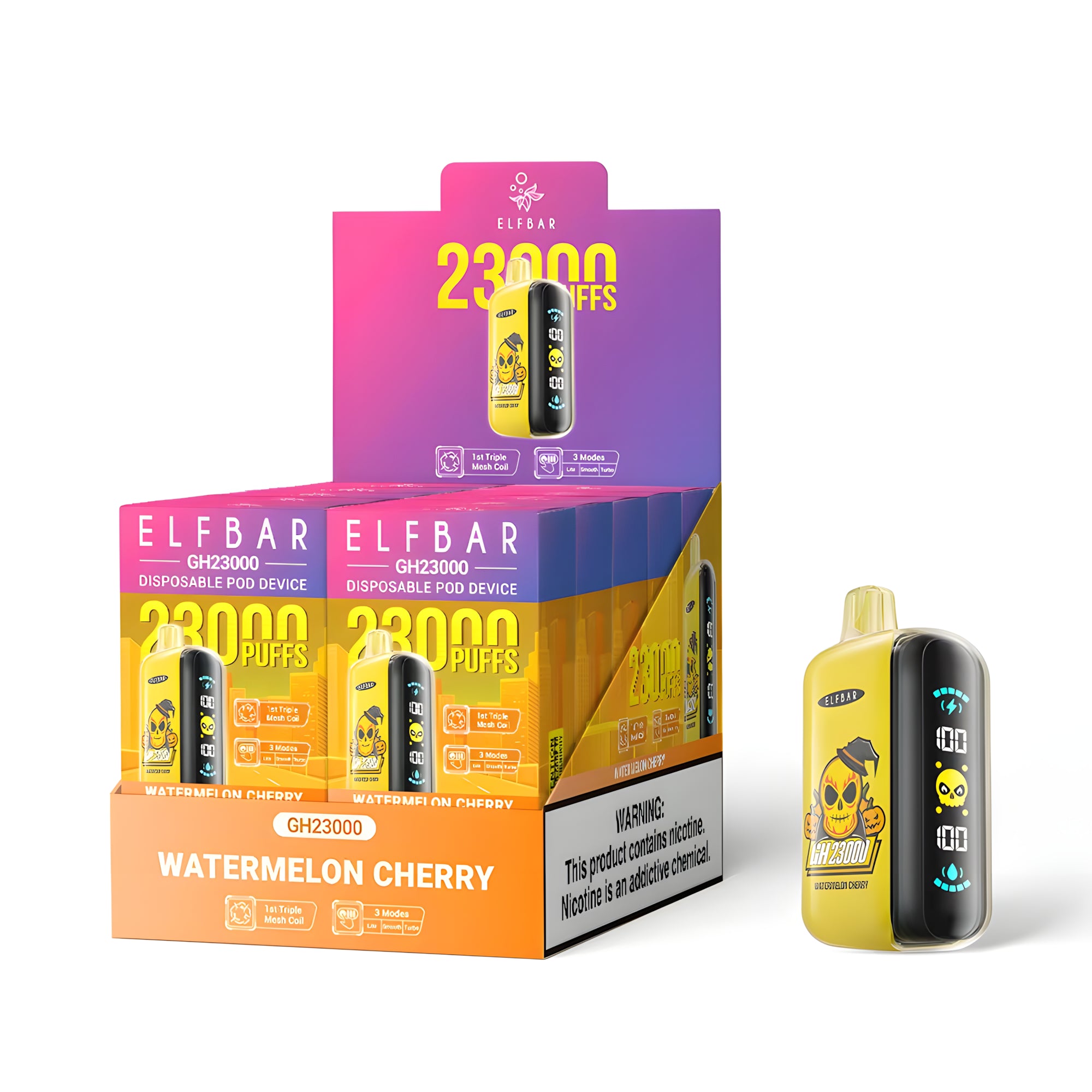 Az Elf Bar GH23000 Watermelon Cherry 5% eldobható vape egy kompakt és kényelmes eszköz, amely a dohányosok és vapelők igényeihez lett tervezve, akik egy gyümölcsös, lédús és prémium ízélményt keresnek. Az előre töltött tartály akár 23 000 slukkot biztosít, és az eszköz három különböző módban használható. A nagy LED kijelző megmutatja, hogy éppen melyik módban van az eszköz, valamint folyamatosan nyomon követheted az akkumulátor és az e-folyadék szintjét.